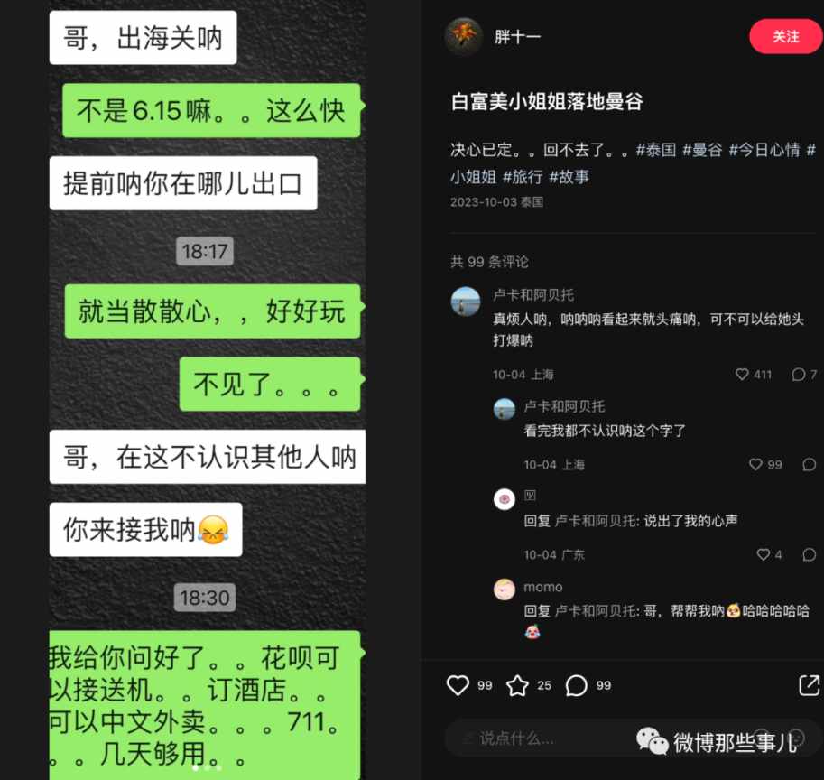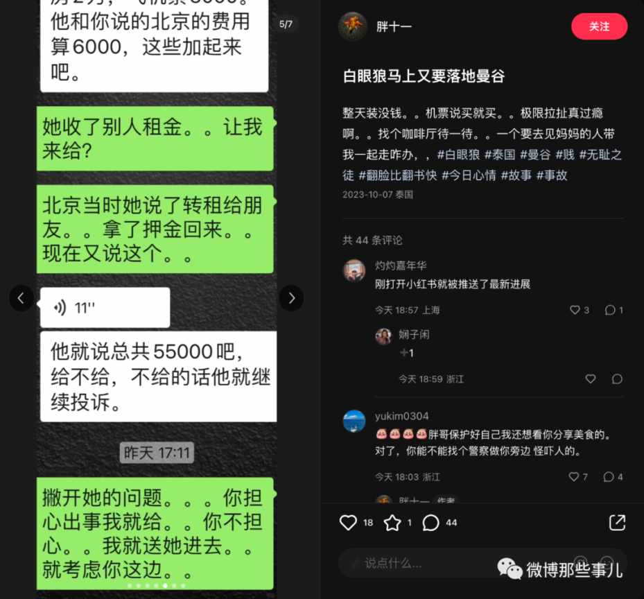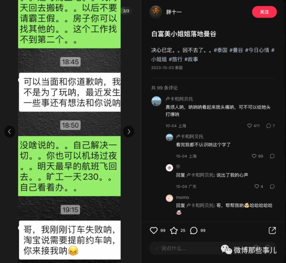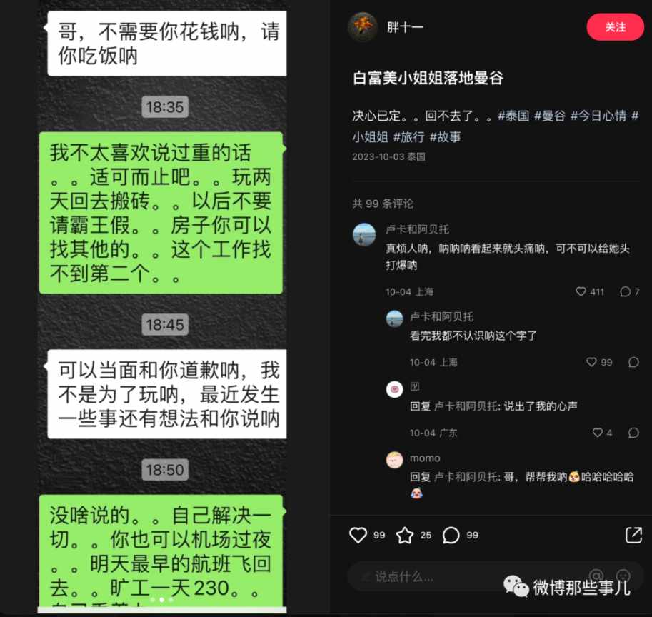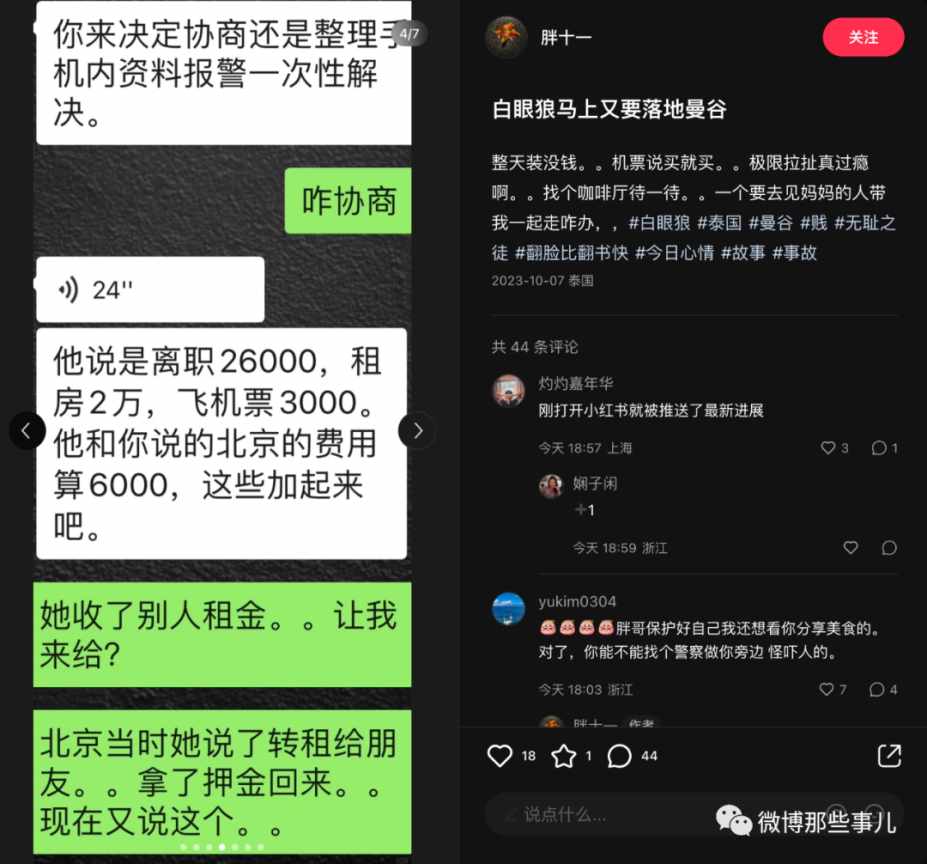 我当时看了就划过了,没想到过几天又刷到后续,这个女生回国后到去那个跑单的富二代家里闹,公司闹,酒吧闹,最后如愿要到钱了,把机票钱还给博主了,到这里我觉得好像有点意思就点了关注。