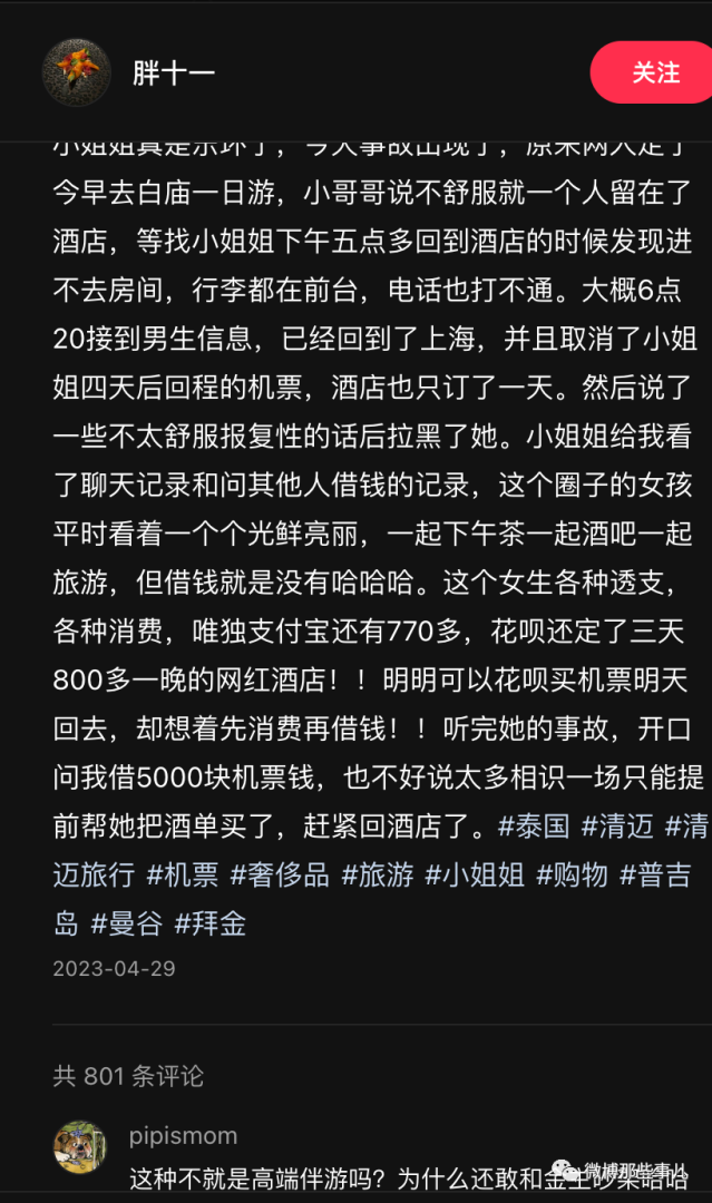 酸不拉几柚子皮:没钱买机票,那个富二代答应带她买买买,结果她要一个好几万的包,富二代说过两天买,第二天出去逛街富二代先回酒店了,等她回去发现行李被拿出来,酒店被退了,四天后回城机票被取消……她就刷花呗继续住酒店伺机寻找下一个客户,没找到吧,身无分文这才对博主下手换到了机票钱