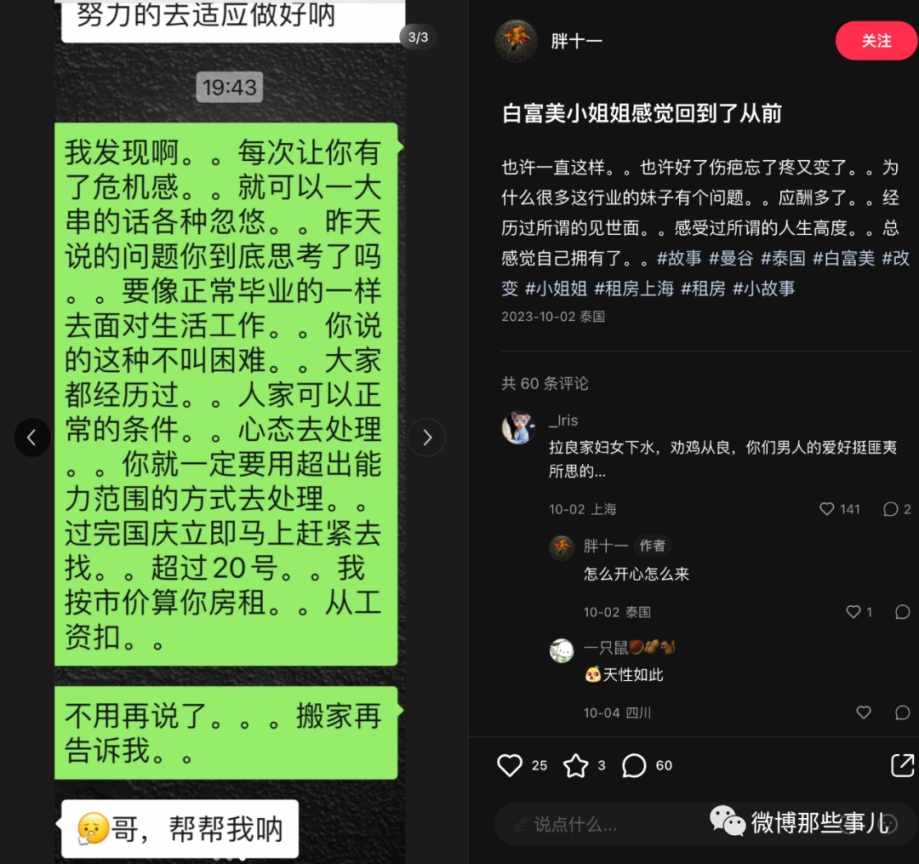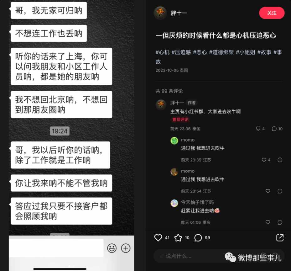 博主知道了她的遭遇,父母都是老赖,家里弟弟读书不行初中完了就去打工,她读书还行,就把她供到了大学,但是因为是老赖,助学贷款没批下来,奖学金也申请不到,读没读完不清楚,后来母亲重病,女生要赚医药费,迫不得已就开始做外wei了,这些博主找人去她老家打听了,真实,缴费单子也看了,五万又五万的交,博主心软了,希望她上岸,就建议她从北京去了上海,介绍她去自己朋友的公司,干月薪6500的活儿,但是私下多给了2500,这样有9k,同时还把自己的可以租1w的房子以2k/月租给她,这期间他们联系不多,博主也定居海外,看上去就是毫无非分之想粉关系。