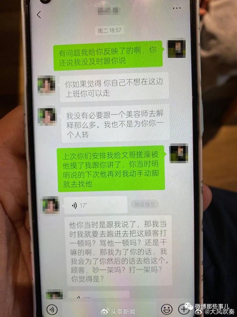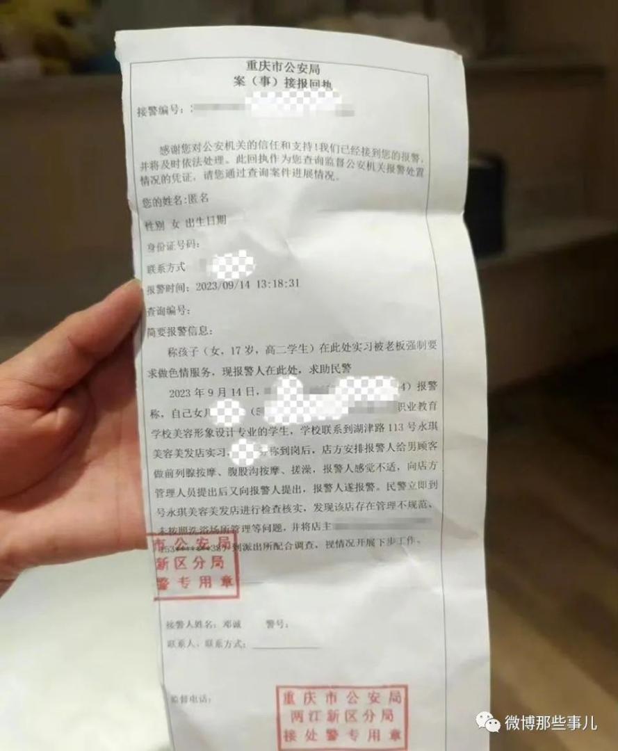 重庆市开州区职业教育中心美容美发专业2021级女生王糖霏(化名)自述,她到重庆主城区专业实习时,遭实习单位安排为男顾客洗澡、前列腺保养按摩等服务。直至今年7月,重庆市开州区职业教育中心美容美发专业的王糖霏等多人,被学校安排进永琪护肤造型湖津支路店实习,并且还签订了三方协议。但是,王糖霏发现自己的工作内容是为男性提供色情服务,7月15日她向班主任老师反映后,老师却以“男顾客也是自愿为原则”来搪塞,最终不了了之。最离谱的是所谓班主任 在收到学生反馈后先是安抚拖延 后面瞒不住了就开始数落 不干可以走 可以报警…这是班主任该说的?要这样的班主任干啥?从头到尾 哪有老师 学校该有的样子直到今年9月,王的父母发现其中问题,选择报警。而该永琪门店的负责人态度强硬,表示:“王糖霏所做的事是她自愿的,因为房内没有监控,也不知是否属实,她的所作所为是她个人的事情。”而且,门店聘请了律师,准备起诉王糖霏对门店的诬告。重庆市公安局两江新区分局官方微博@平安两江新区 21日发布警情通报:媒体报道“职校女生实习被安排为男宾洗澡保养前列腺”,警方已接到报警并介入调查。目前,市局治安总队派员督导,成立工作专班,对涉事相关门店工作人员、会员客户等正开展调查询问,全面深入核查该门店是否存在提供色情服务等情况。相关调查情况及时向社会公布。如果这都不算色情,小编我第一个不服!!!!!!!!!!!!!!