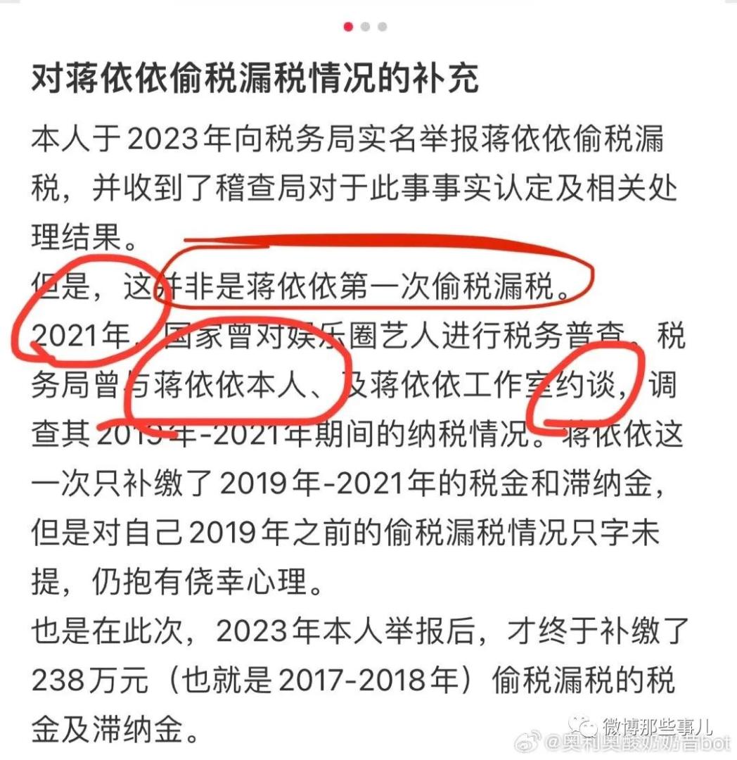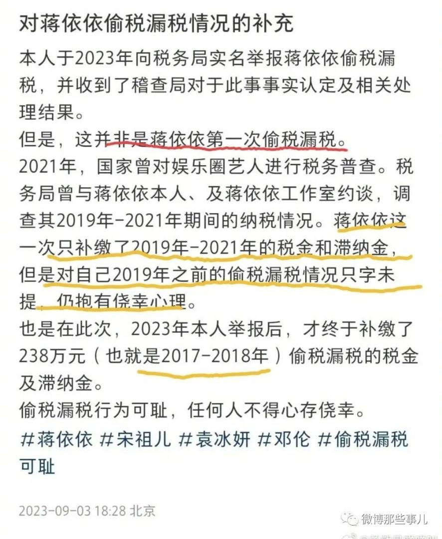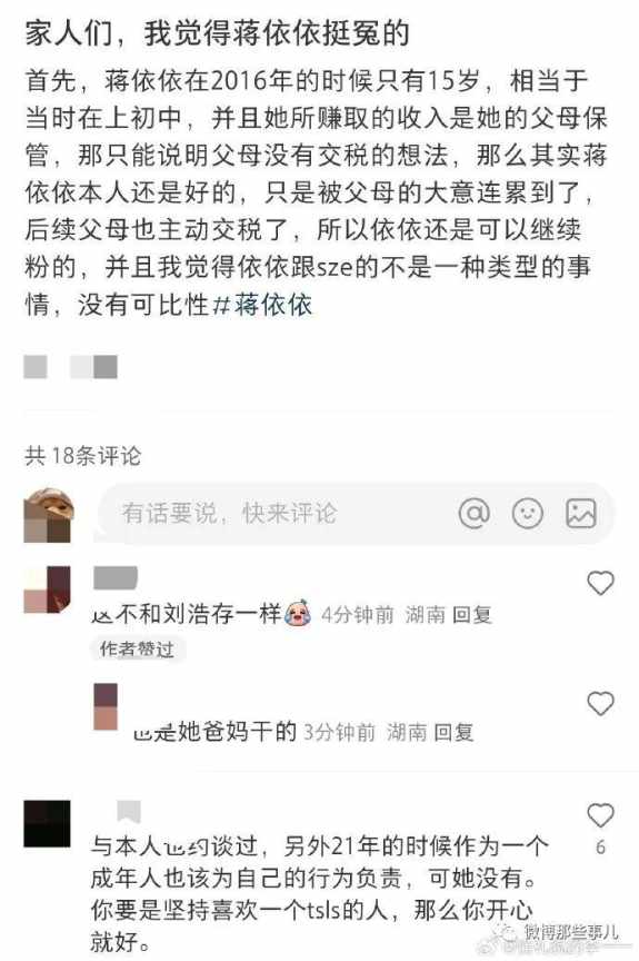 这还不到晚上就塌了,小红书有网友实名举报蒋依依偷税漏税2016-2021年,收入1600万,在明星里不算高,她这几年,只有两部主演作品,而且都是低成本作品,其它全部是打酱油。有微博网友说这个收入不高,这都相当于在娱乐圈兼职了但是,有网友看了举报之后,替她找理由了“蒋依依其实挺冤枉的吧?”首先,蒋依依在2016年的时候只有15岁,相当于当时在上初中,并且她所赚取的收入是她的父母保管,那只能说明父母没有交税的想法,那么其实蒋依依本人还是好的,只是被父母的大意连累到了,后续父母也主动交税了,所以依依还是可以继续粉的,并且我觉得依依跟sze的不是一种类型的事情,没有可比性!但,很快就有网友反驳,哪里冤???1.本人知情2.第一次被约谈后还是不补完才被举报