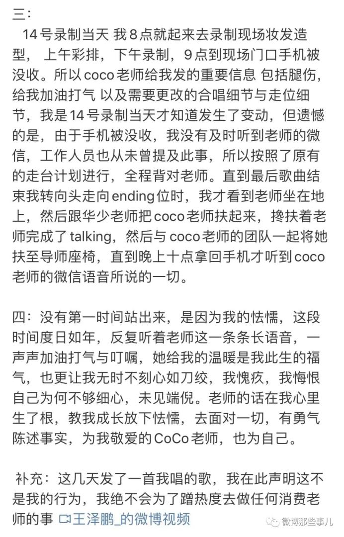 歌手李玟生前控诉《中国好声音》赛制不公的视频近日在网络上疯传,特别是李玟在节目中摔倒的事情引起极大关注。《中国好声音》李玟战队学员@王泽鹏_ 今天发博,并配有17分钟视频,就当天发生的事情进行回应说明。“没有第一时间站出来,是因为我的怯懦,这段时间度日如年,反复听着老师这一条条长语音,一声声加油打气与叮嘱,她给我的温暖是我此生的福气,也更让我无时不刻心如刀绞,我愧疚,我悔恨自己为何不够细心,未见端倪。老师的话在我心里生了根,教我成长放下怯懦,去面对一切,有勇气陈述事实,为我敬爱的CoCo老师,也为自己。”王泽鹏能发这个声明就已经很有勇气了,毕竟节目组coco都敢整,他一个新人又有多少话语权呢,这个声明就代表着前程尽毁!接下来可能面临雪藏甚至赔钱,以后的前途也很难说….20日晚,浙江广电集团就近期《中国好声音》节目引发的争议作出回应,表示将进一步调查核实,并接受广大观众和网友监督。