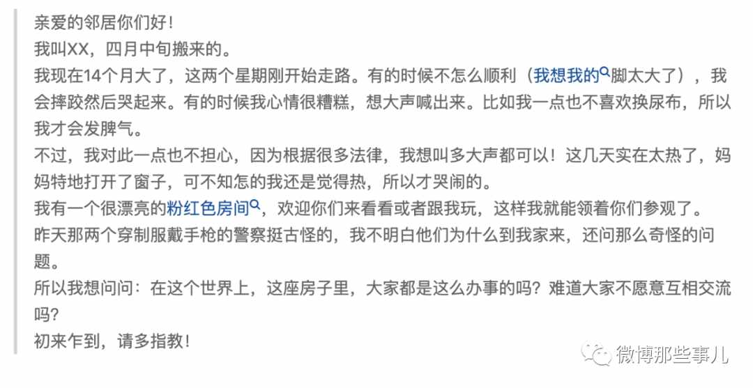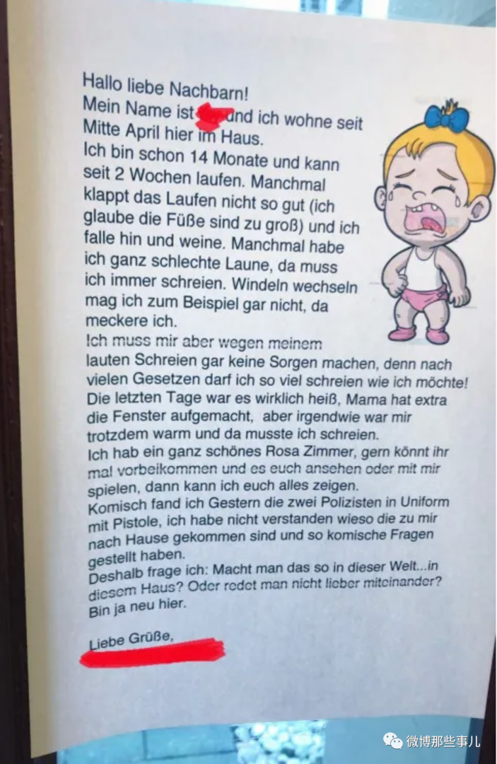 实际上,为了满足对声音特殊要求的旅客,2020年12月24日起,铁路部门在京沪高铁、成渝高铁的部分车次试点“静音车厢”服务。 截至2023年4月,多趟复兴号智能动车组列车专门设有静音车厢。高铁的车厢设置正在完善,但是关于婴儿在公众场合哭声的讨论远没有结束。在对噪音非常不能容忍的德国,立有一条翻译过来叫“安静时间”的法律。每天的22:00-6:00,居民必须保持安静,否则,邻居打个电话就会有?♀️?敲门来开罚单。但,婴儿哭闹是个例外,不管他们什么时候哭,哭多大声,居民都必须接受和容忍。偏有不信邪的人,在夜间听到婴儿啼哭时报了警,结果家长很生气,以婴儿的口吻写了一封公开信:
