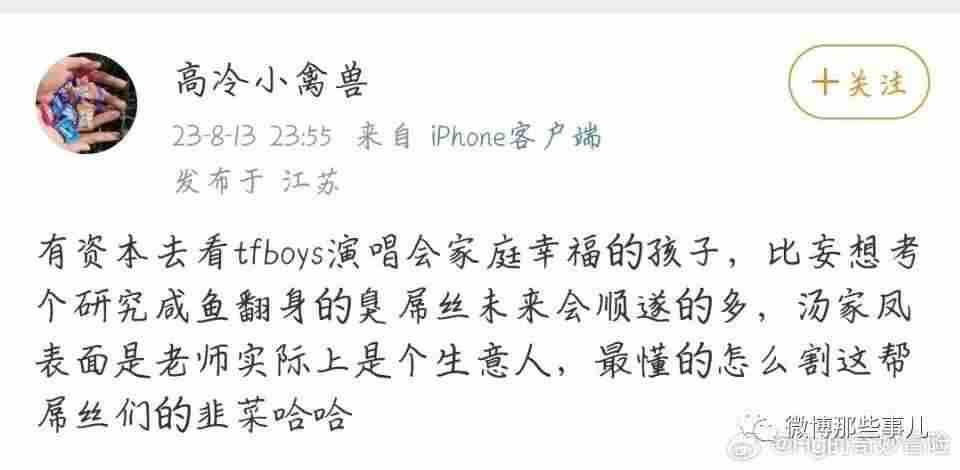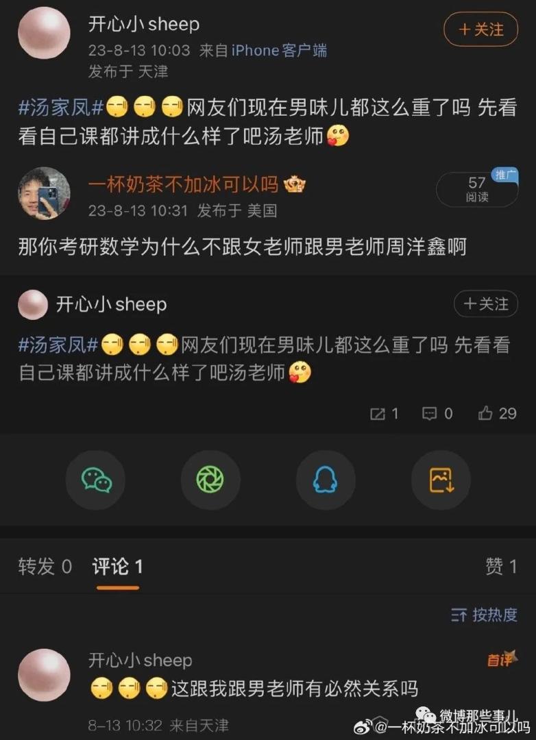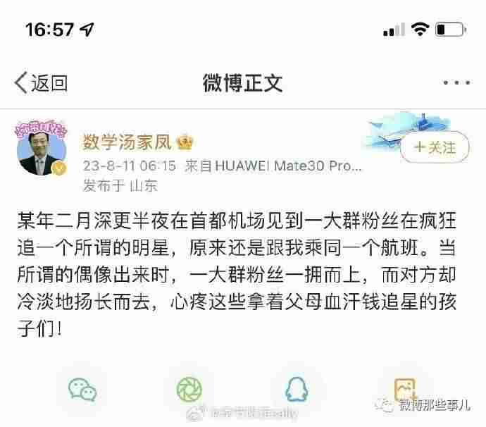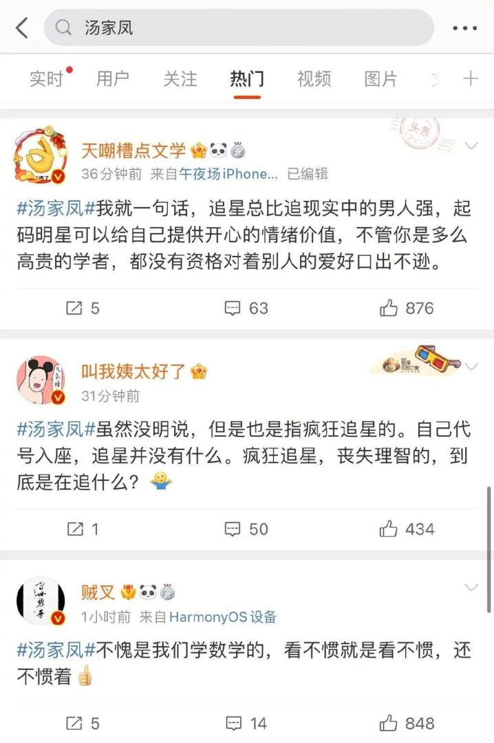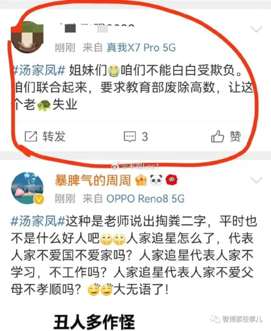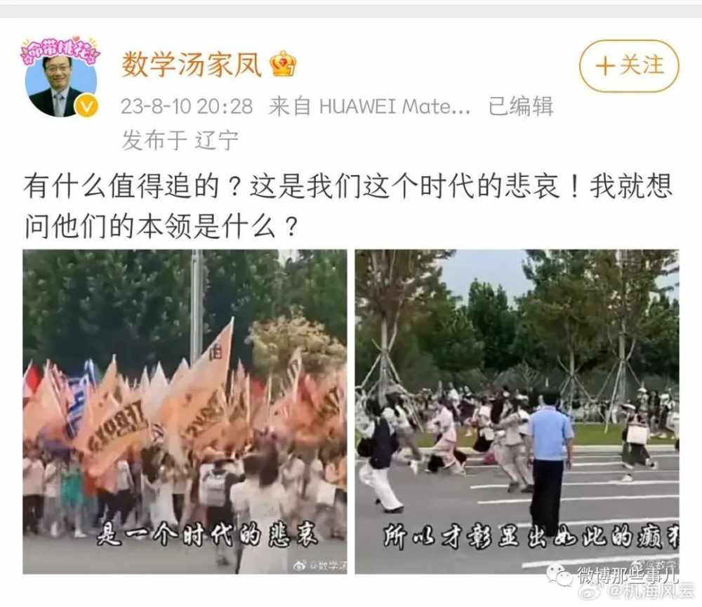 由此可以看出,这位老师坚信“学海无涯苦作舟”,他这一辈子可能永远无法理解TFBOYS靠什么受如此追捧。这位学界的大佬,在看了TFboys十周年演唱会粉丝狂热的举大旗游行后,有感而发:汤家凤不出意外被粉丝集火了,甚至有粉丝要求教育部废除高数,让汤家凤失业。热闹的场面引发了粉丝和网友的对线,而且很多都是考研的学生,粉丝可能不知道累死累活复习一天的考研人刷个微博,戾气能有多大