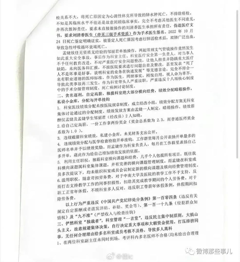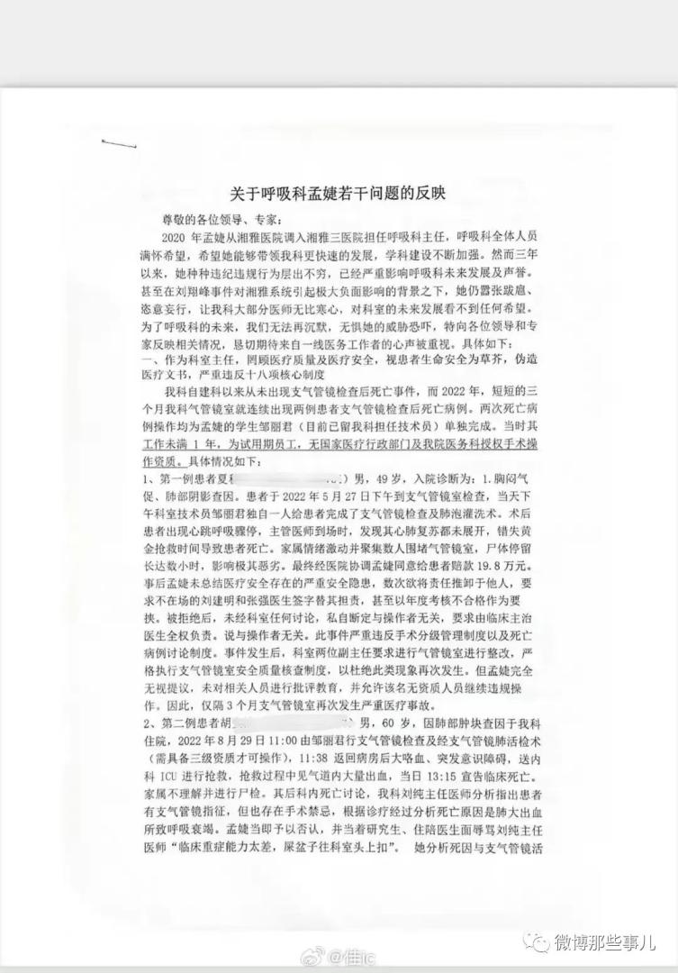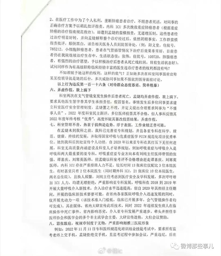 举报信称,孟婕“放任”其无手术操作资质的学生邹某单独进行支气管镜检查,导致三个月内发生2例患者死亡事件,事发后孟婕伪造医疗文书,要求其他医生签字担责。此外,举报者还反映孟婕“暗箱操作”绩效分配、私设小金库、财务不公开、打压排挤同事等问题。