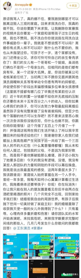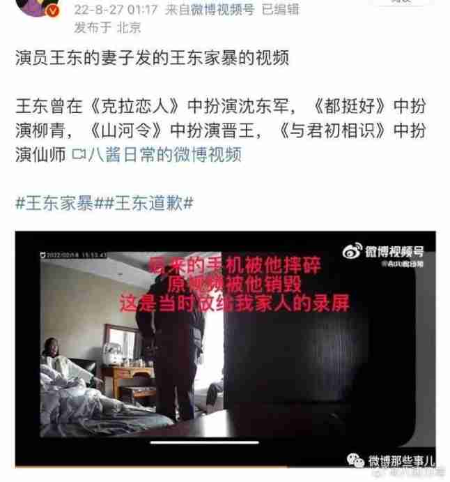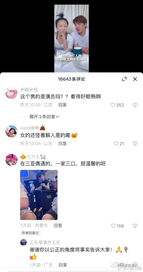 11月3日,王东妻子再发文,透露王东要求她删除家暴视频,还要发一个家庭和谐帮孩子过生日的视频。11月23日,王东妻子再次发布视频并求助称:“被婆婆赶出家门,被公公开车撞。”据悉,演员王东曾出演过《与君初相识》、《克拉恋人》和《都挺好》等多部电视剧作品。