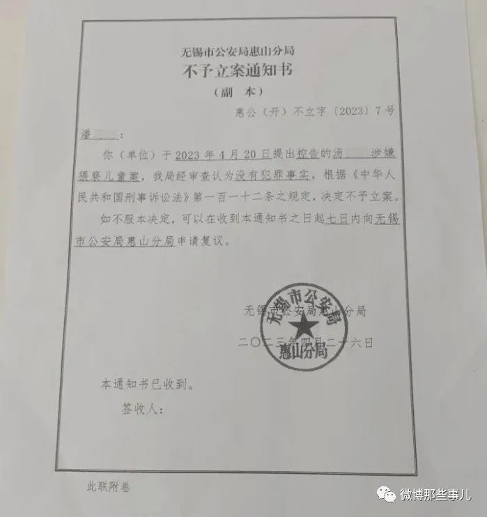 4月26日,无锡市公安局惠山分局出具了一份不予立案通知书。