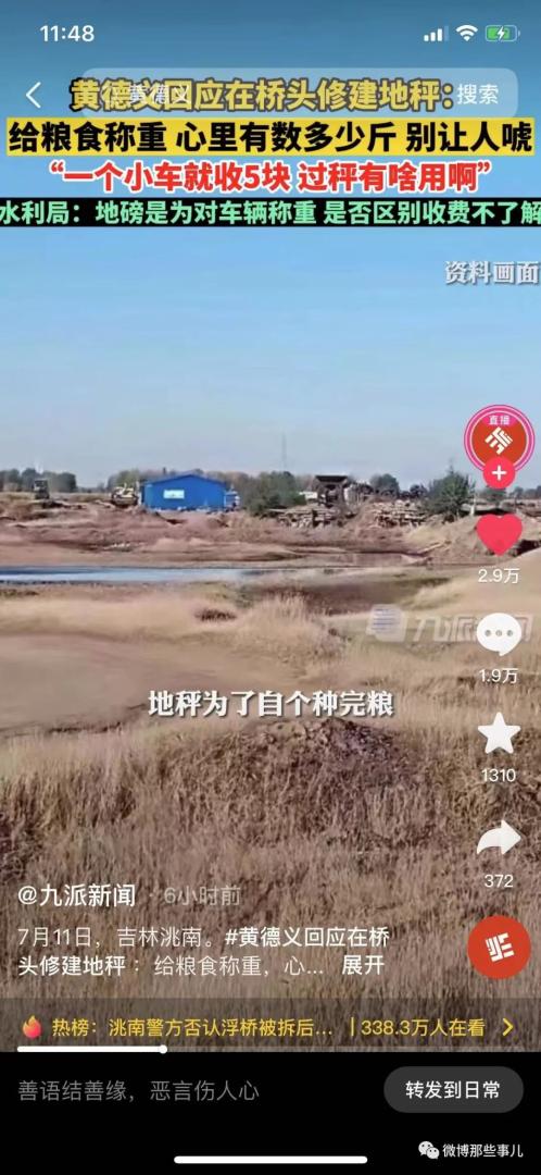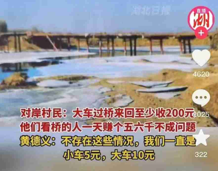 有记者采访了当地货车司机,司机证实了,大车重车过一次收200,空车回来收50。收起讲价到重车一次150,回来空车50,一去一会200元。他一冬天过桥费至少付了7000元。对于建桥了,为什么还安地秤,黄德义表示为了:自己种完粮,心里有数多少斤。对于挖断河床这事,黄德义表示不是自己干的,收费也没有区别对待,都是按照小车5元,大车10元