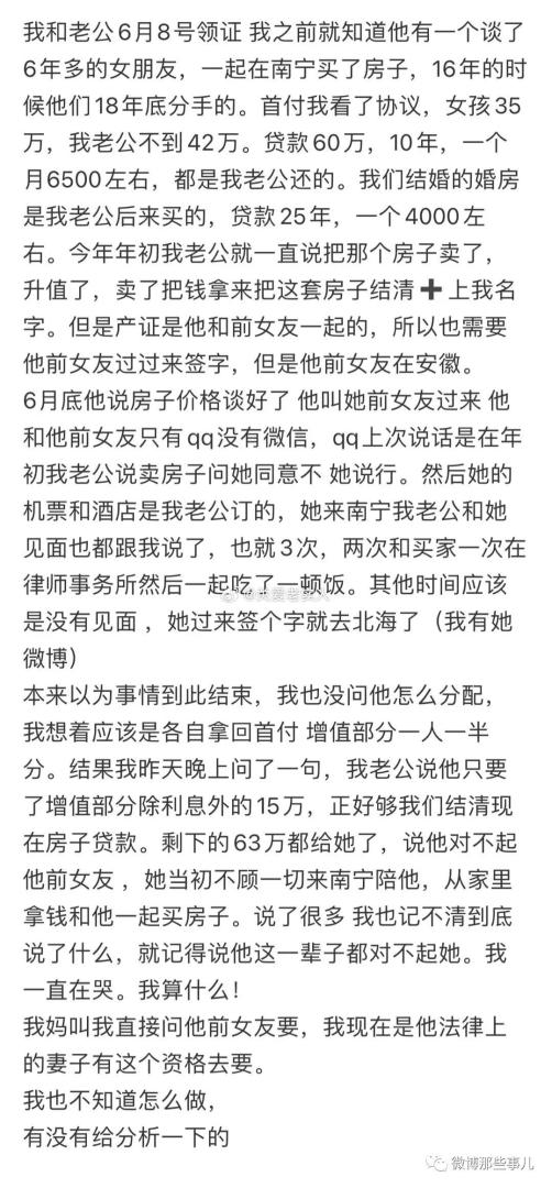 今天也没有好好学习哎:我觉得她的意思应该是双方应该对半分 那就是接近40w 最后他老公拿了15 多给了前女友25