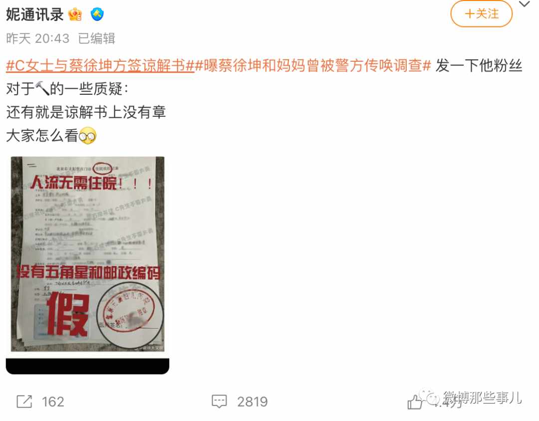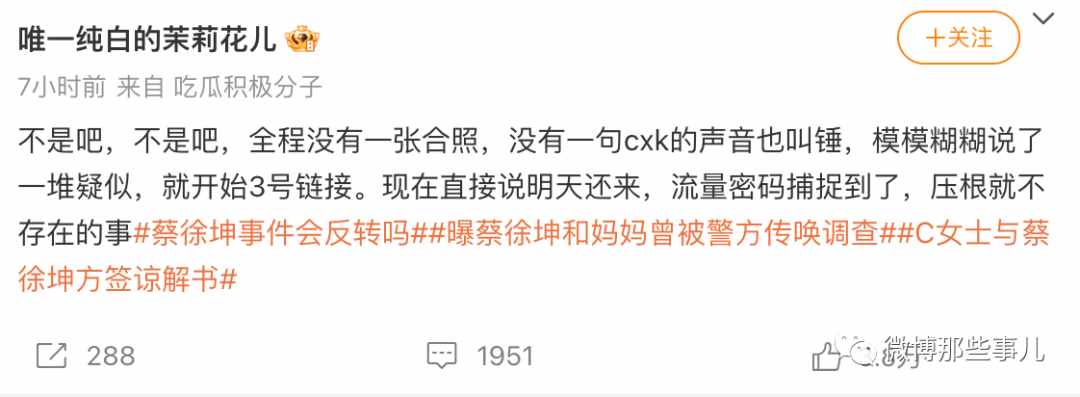 狗仔已经点名道姓地指出蔡徐坤与C女士打胎的瓜,且直接指出蔡徐坤妈妈让女方打胎,甚至追踪女方,都立刑事案件了。即使如此,蔡徐坤方不仅没对狗仔的言论进行报警,甚至连律师函都不发。所以对于吃瓜群众来说,是完全相信狗仔爆料了。